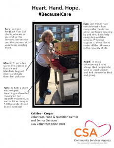 We are delighted to feature Kathleen Creger in this week’s #BecauseICare campaign. Kathleen is a longtime CSA volunteer, and currently helps out in the Food & Nutrition Center and Senior Services