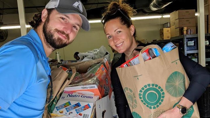 (video background switches to another scene with a CSA Staff sorting groceries into baskets to a young woman, Simone Berkowitz, answering a call)